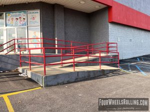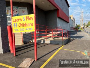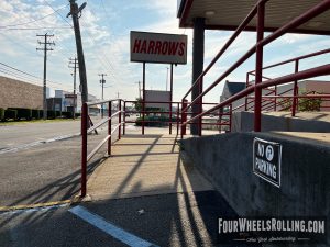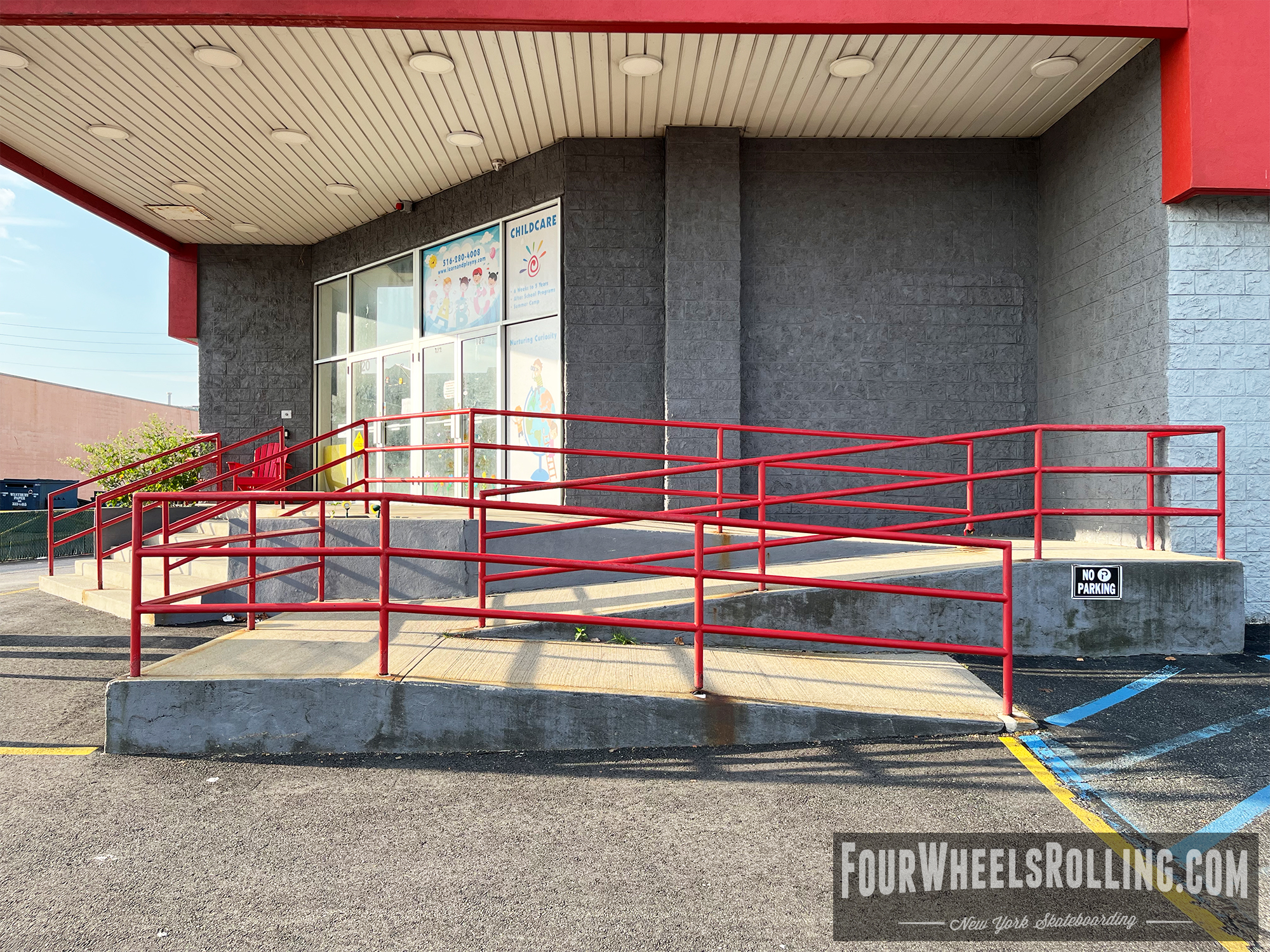Description: Located at the entrance of the Harrow’s building is a bump to bar. The landing has two sign posts so you need to swerve around or thread the needle.