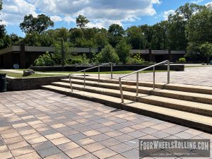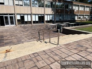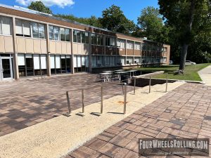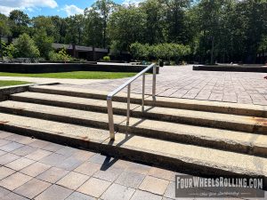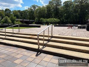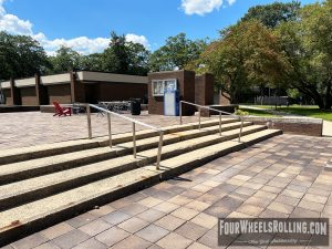 Description: The NYIT campus has a few spots scattered around. Located between Anna Rubin Hall and Harry J. Schure Hall is a longer sized 4 set with handrails, brick runup/ landing. Near the parking lot of the Osteopathic Medicine building is another longer sized 4 set with high handrails. One rail is bent and the landing is downhill. There is also a 15 set rail at the end of the first parking lot on Valentine Ln.