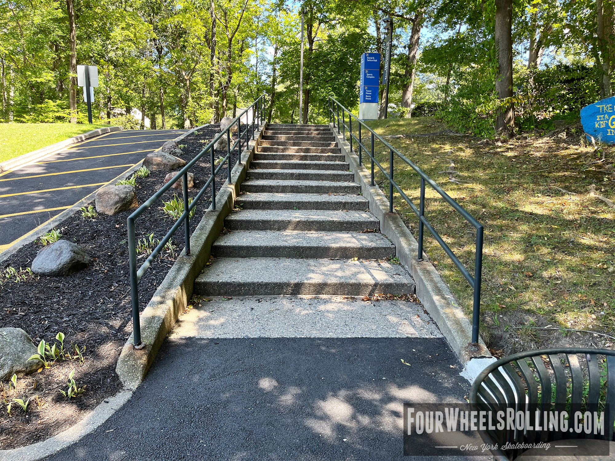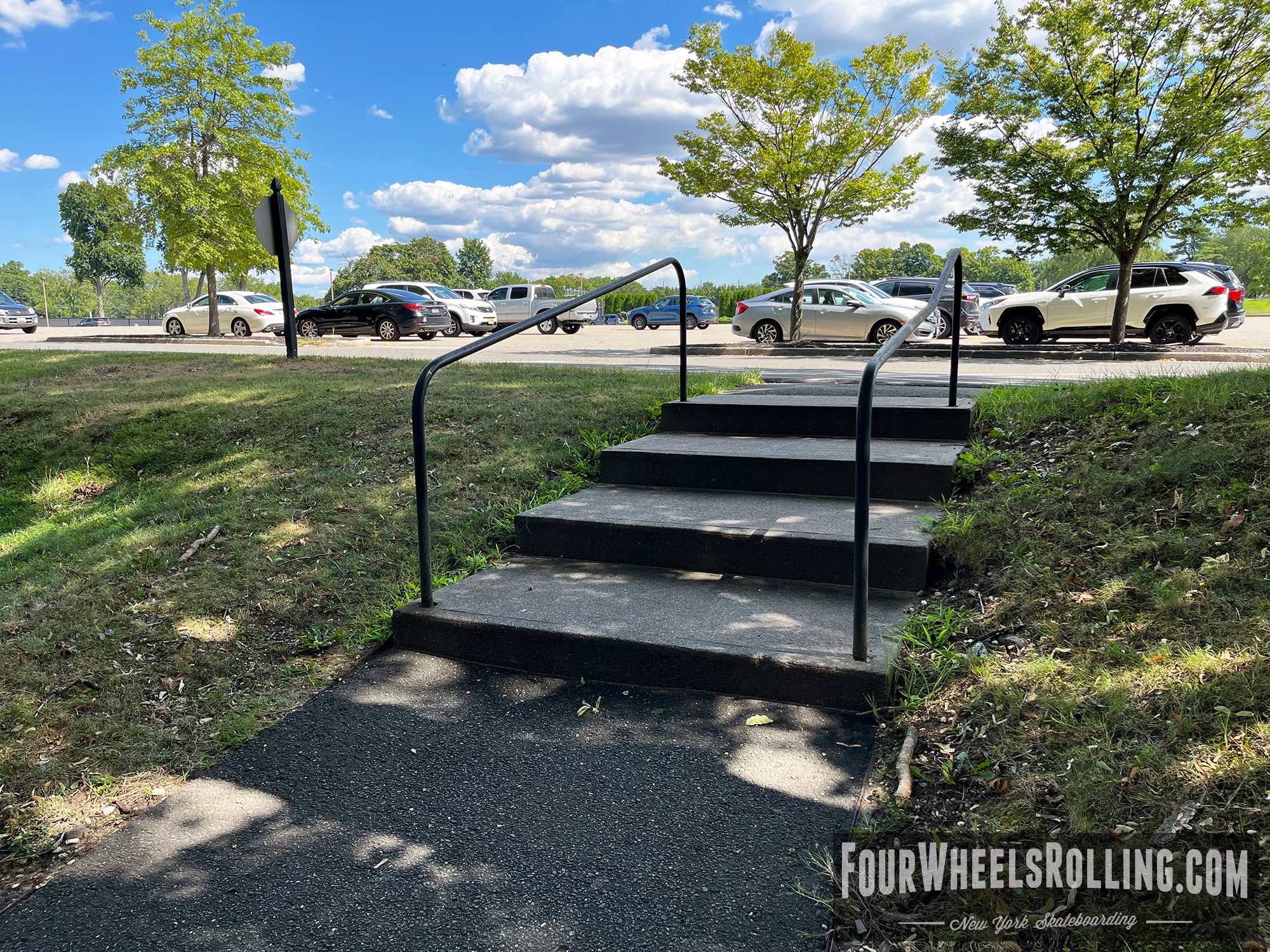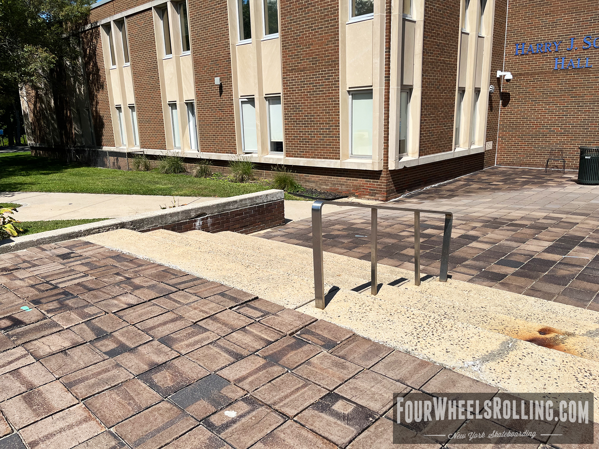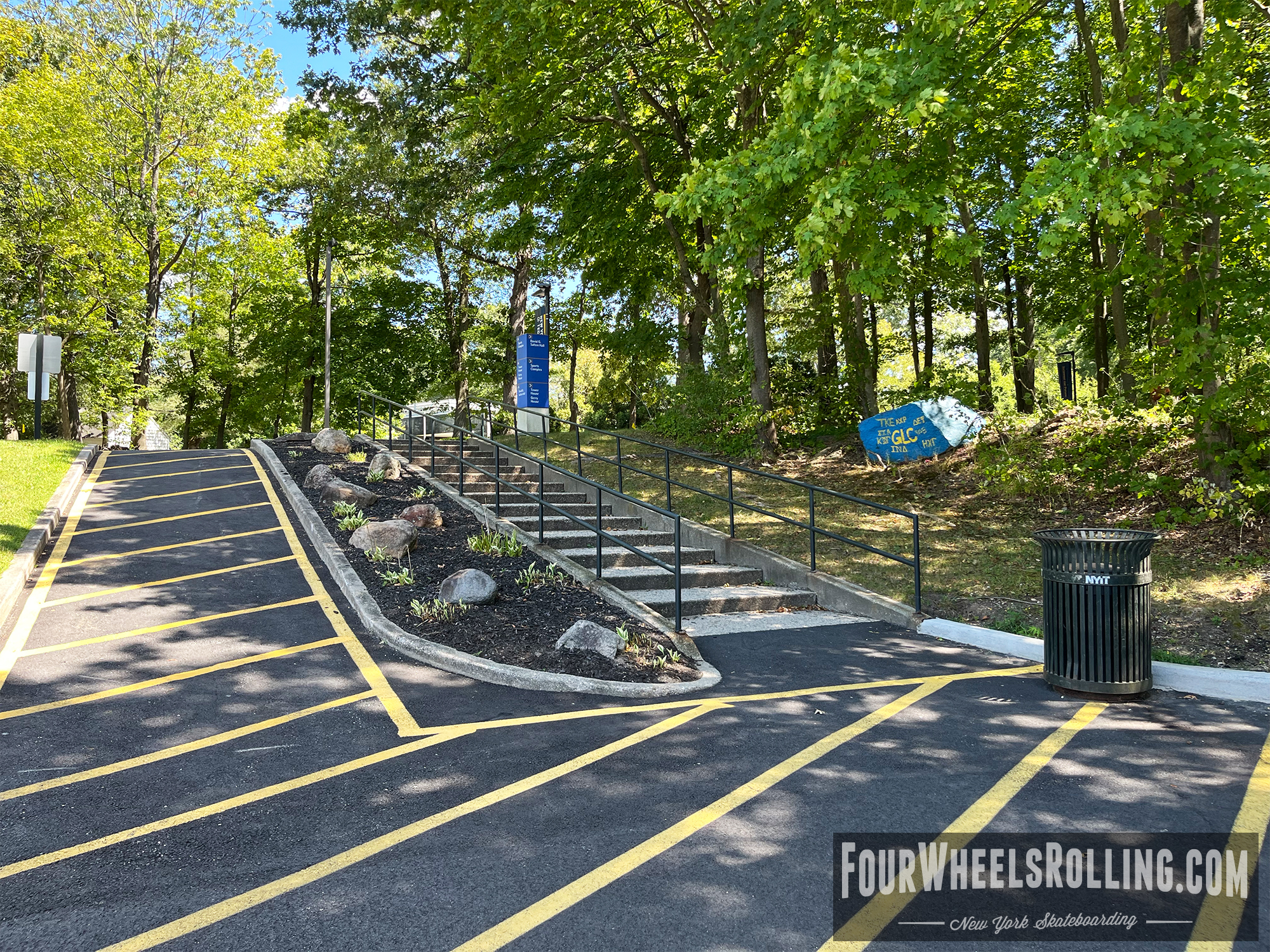 Description: The NYIT campus has a few spots scattered around. Located between Anna Rubin Hall and Harry J. Schure Hall is a longer sized 4 set with handrails, brick runup/ landing. Near the parking lot of the Osteopathic Medicine building is another longer sized 4 set with high handrails. One rail is bent and the landing is downhill. There is also a 15 set rail at the end of the first parking lot on Valentine Ln.