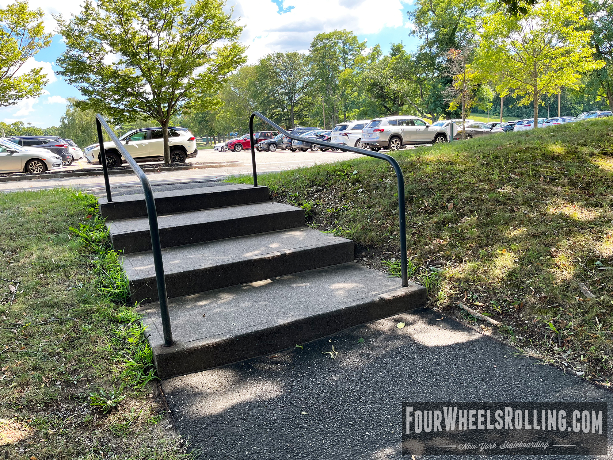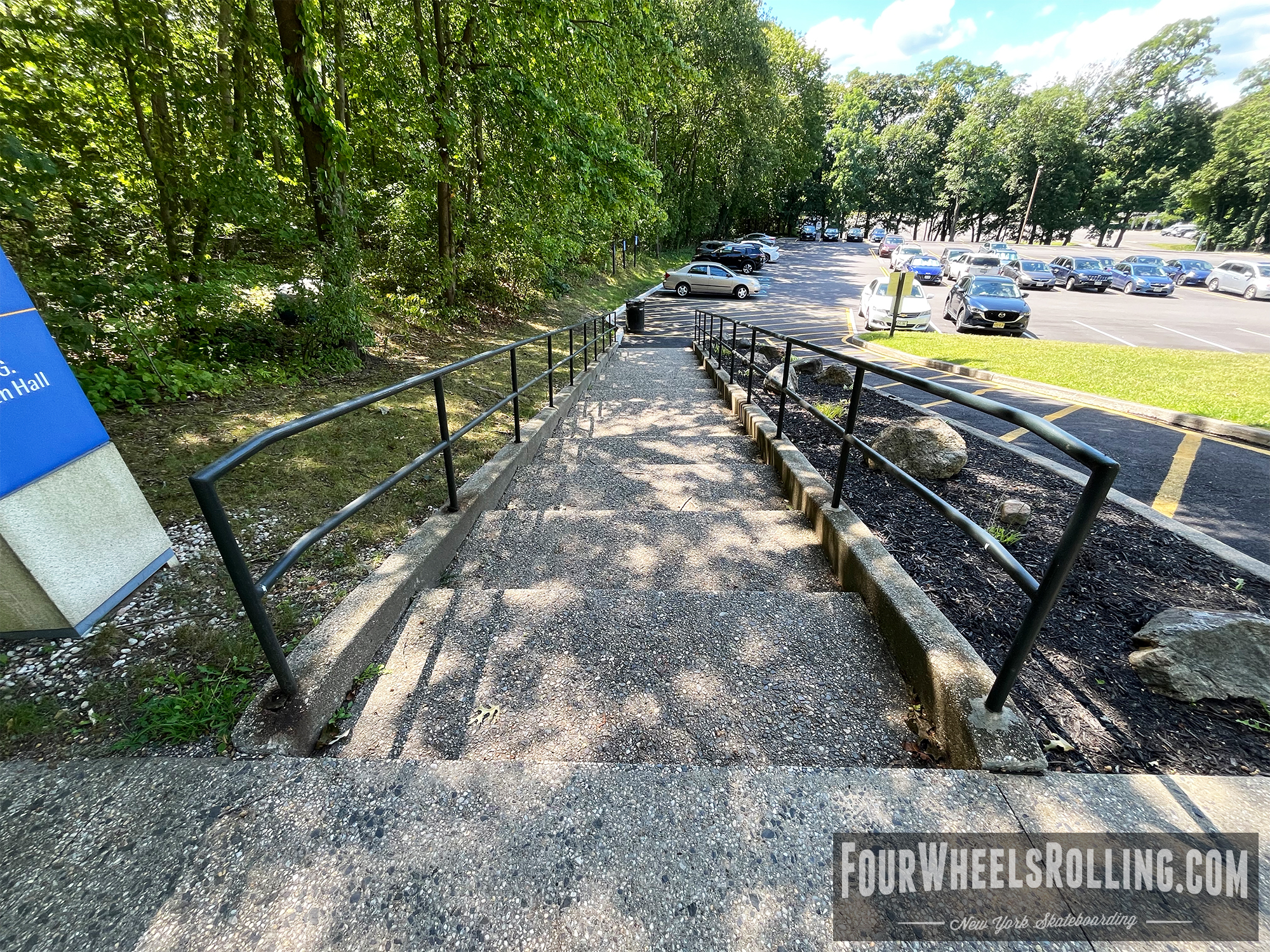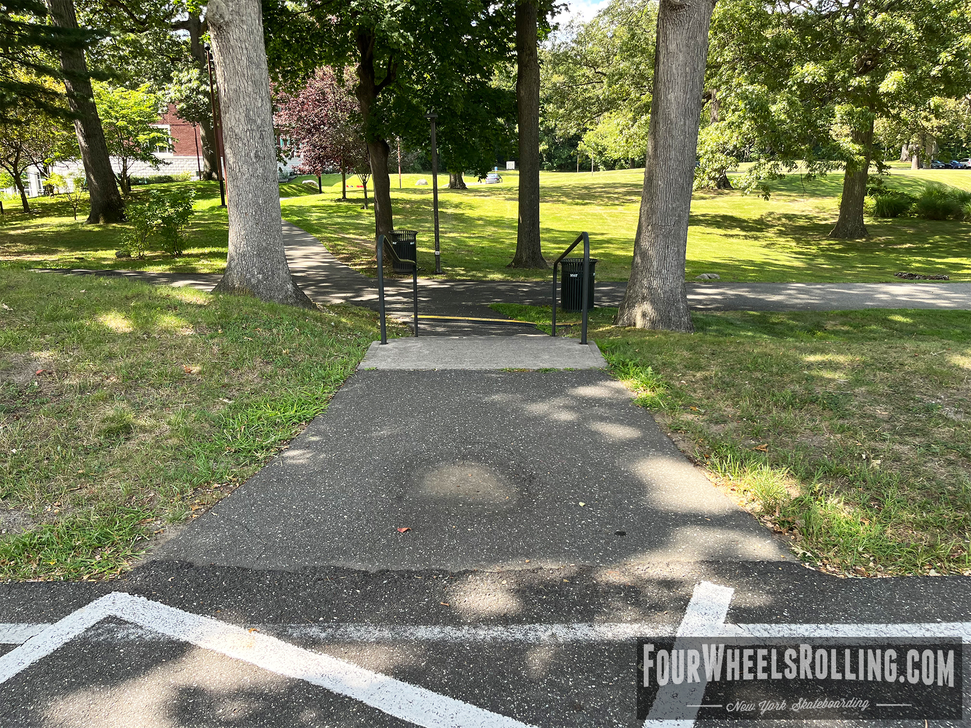 Description: The NYIT campus has a few spots scattered around. Located between Anna Rubin Hall and Harry J. Schure Hall is a longer sized 4 set with handrails, brick runup/ landing. Near the parking lot of the Osteopathic Medicine building is another longer sized 4 set with high handrails. One rail is bent and the landing is downhill. There is also a 15 set rail at the end of the first parking lot on Valentine Ln.