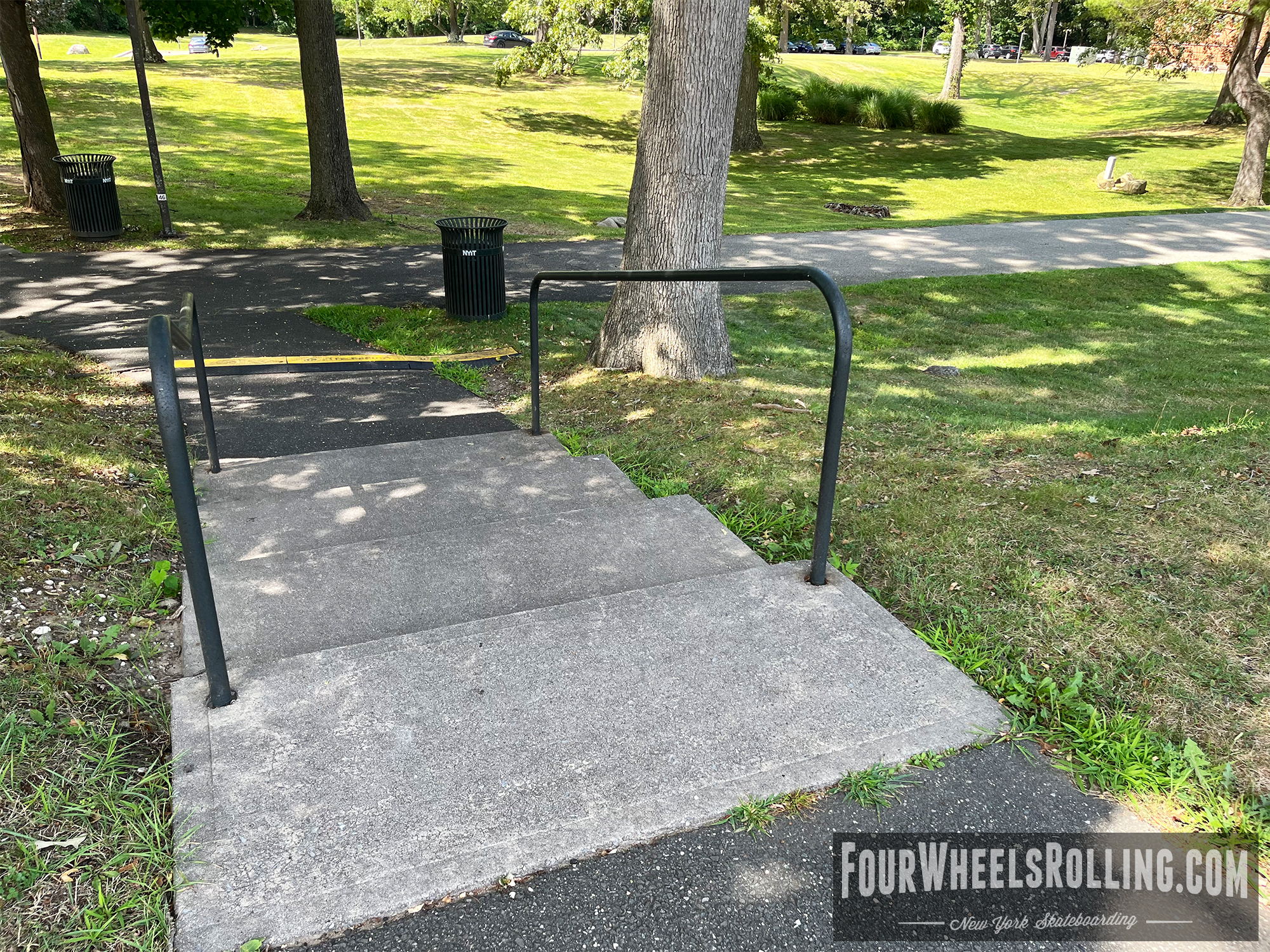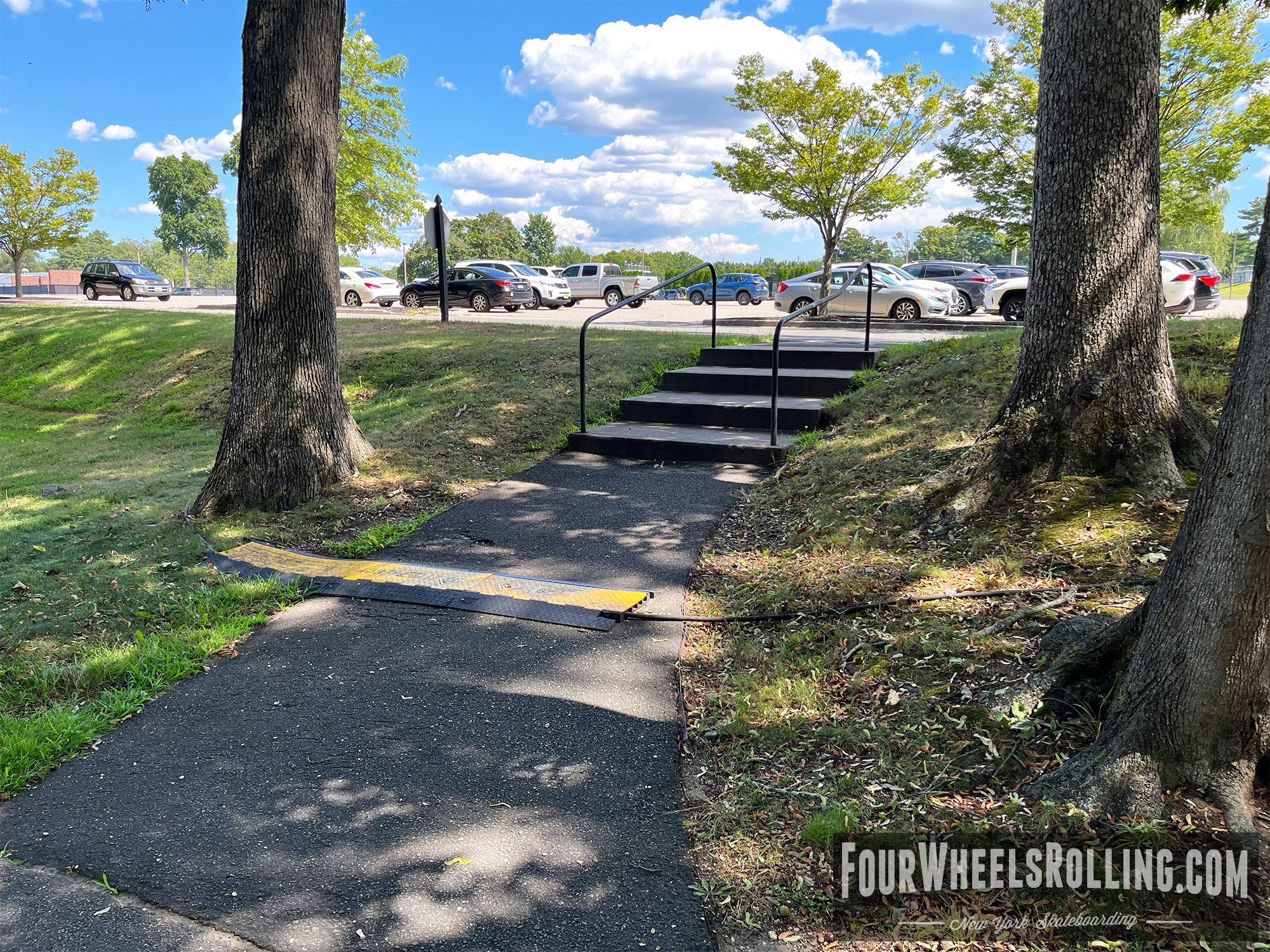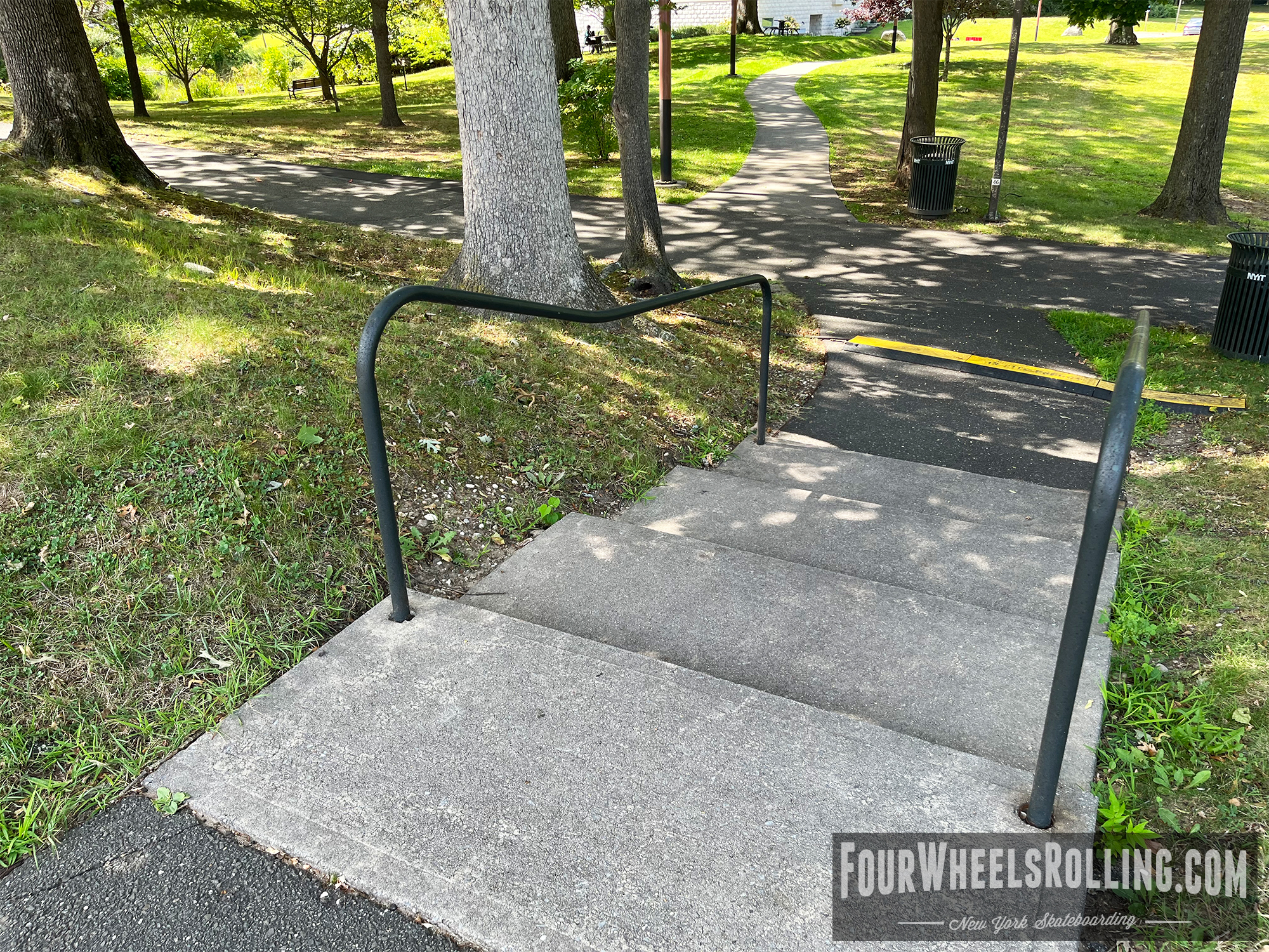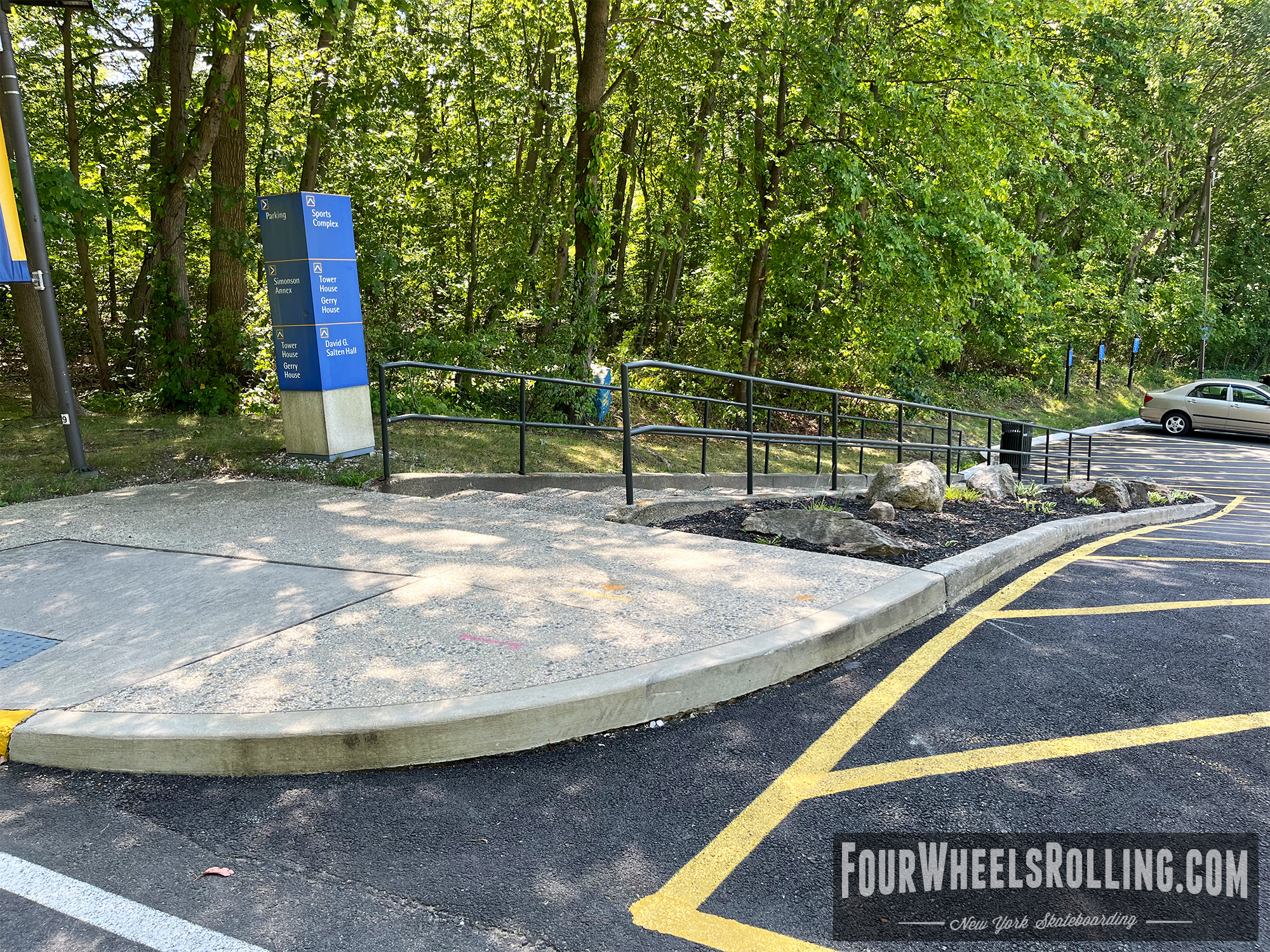 Description: The NYIT campus has a few spots scattered around. Located between Anna Rubin Hall and Harry J. Schure Hall is a longer sized 4 set with handrails, brick runup/ landing. Near the parking lot of the Osteopathic Medicine building is another longer sized 4 set with high handrails. One rail is bent and the landing is downhill. There is also a 15 set rail at the end of the first parking lot on Valentine Ln.