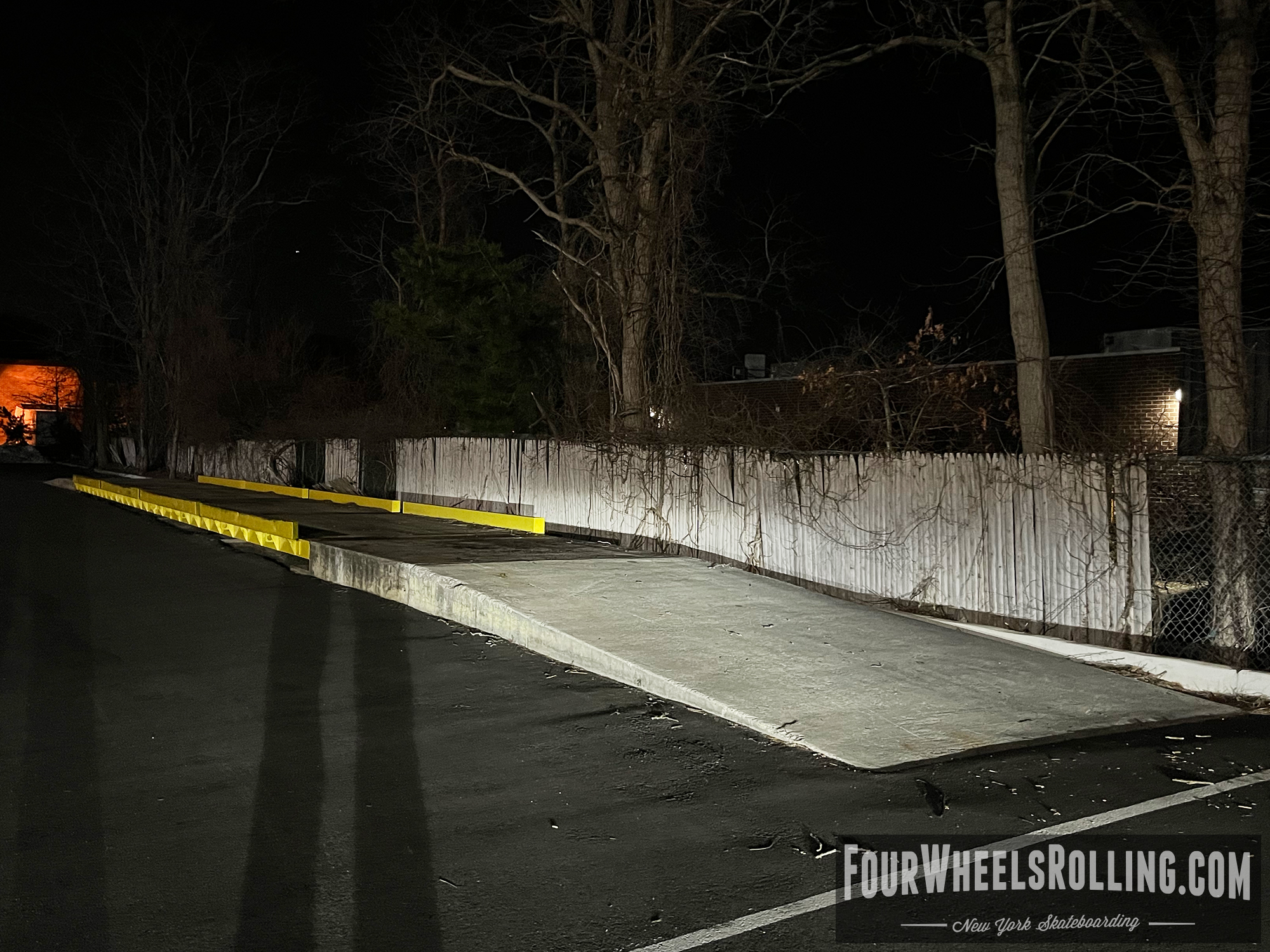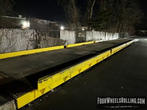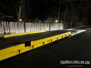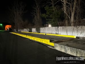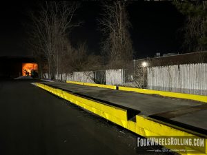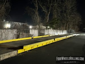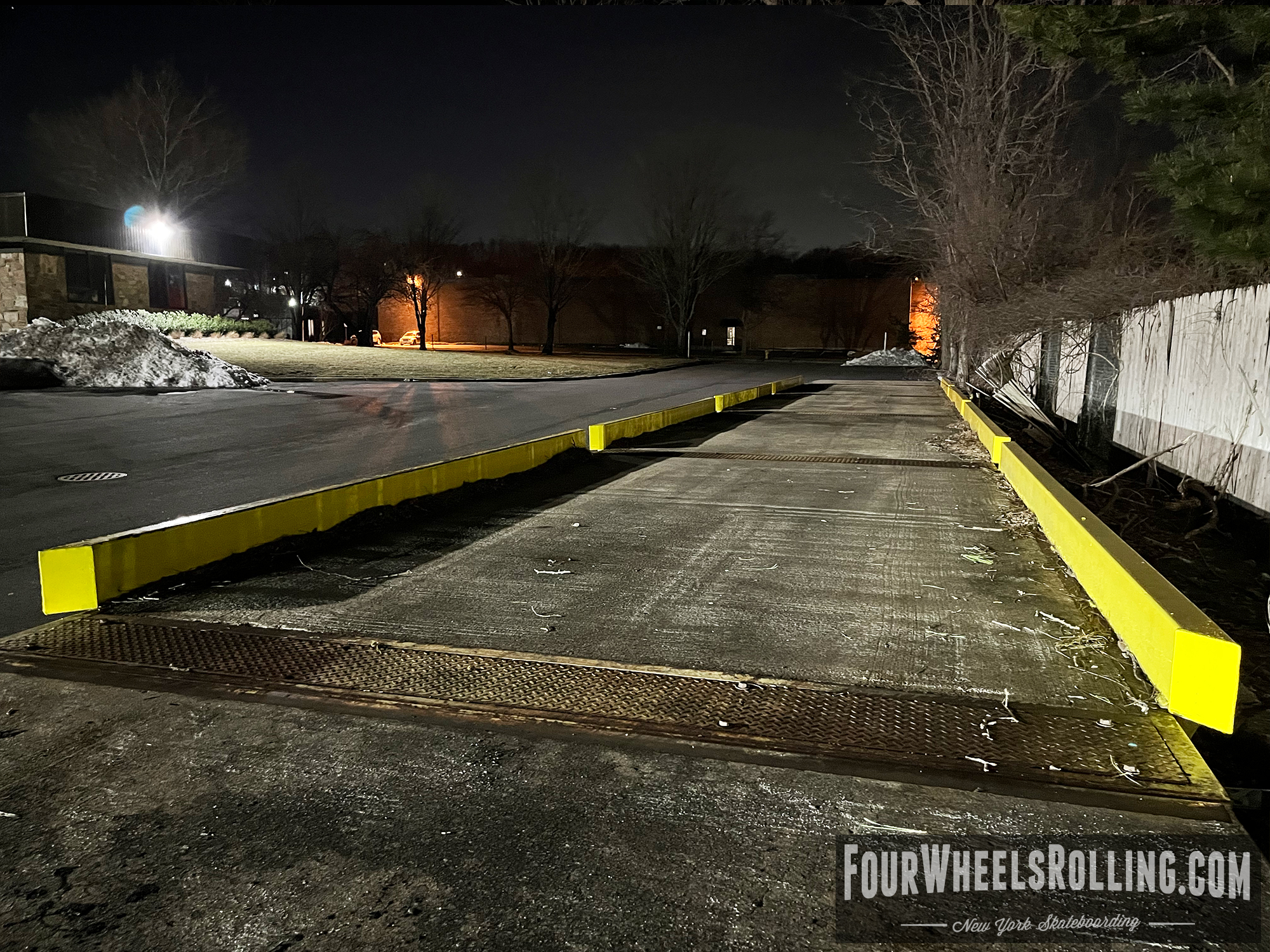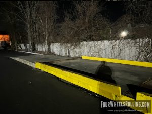 Description: Located at the side parking lot of the fabric store is a loading dock/ weigh station that has sections of metal flatbars on top. There are many ways to skate this spot.