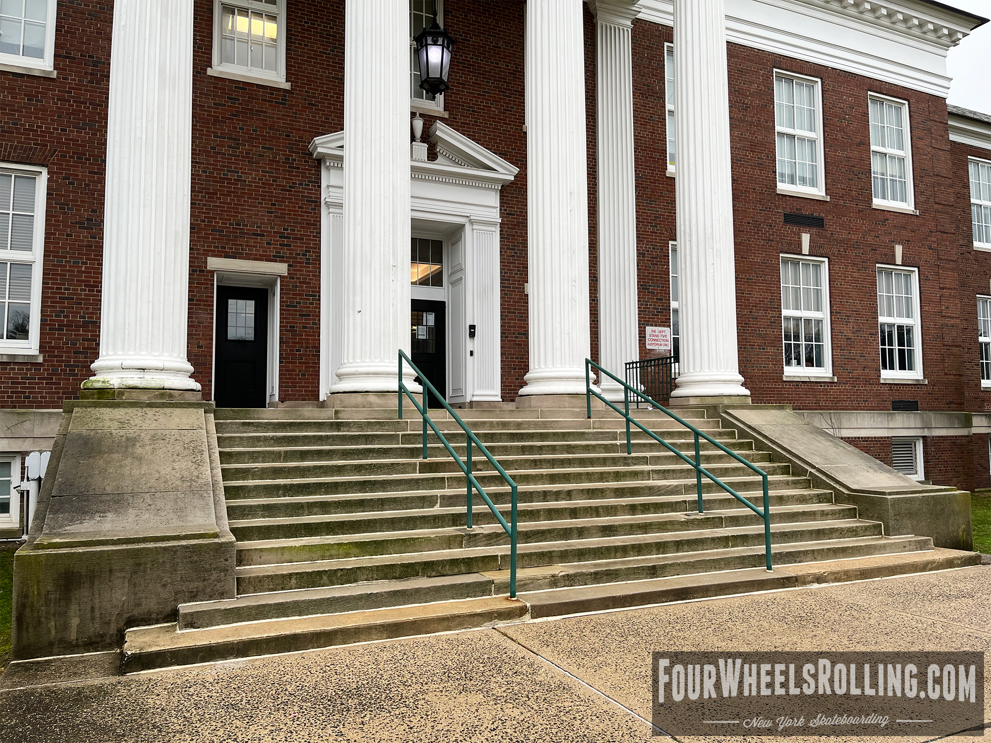 Description: Located at the Lawrence Public School on Broadway is a 5, 6, 8 and 12 set. On the side of the building there is a 6 and 8 set with handrails. Both runups have a crack before the rail. The 5 and 12 are at the entrance facing Broadway. The 12 hubba is mostly skated into as a bank to drop.