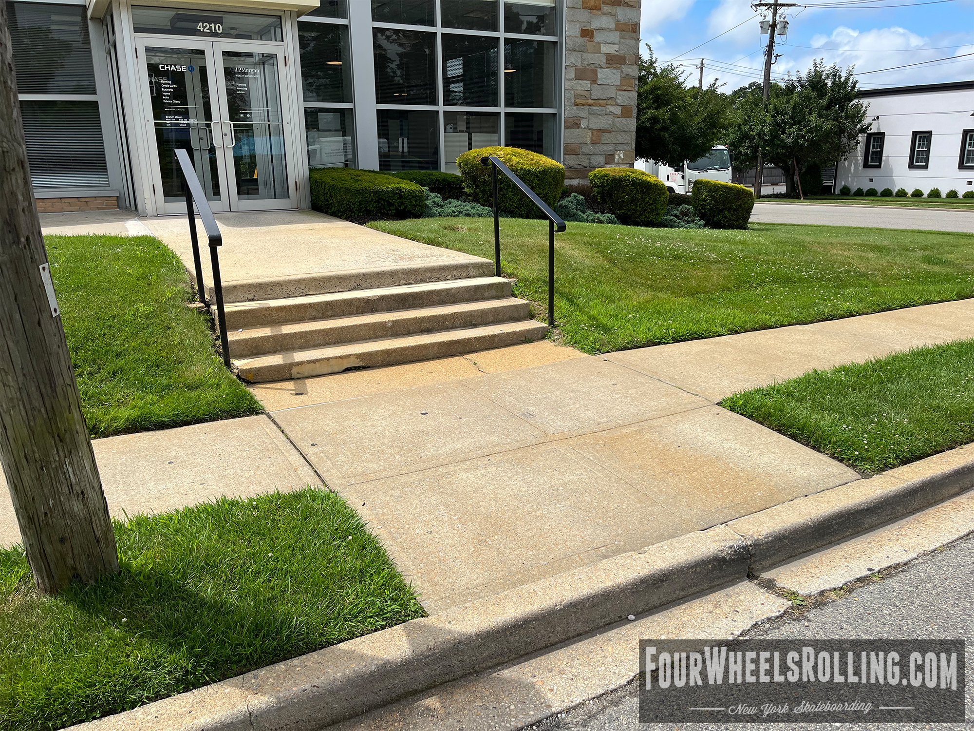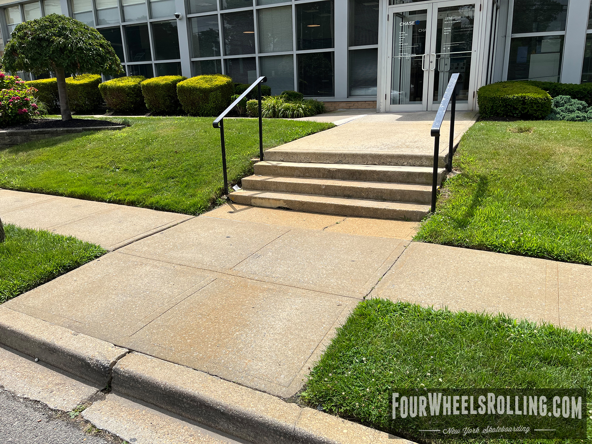 Description: 4 stair located at the entrance of Chase Bank. Short, weathered runup.